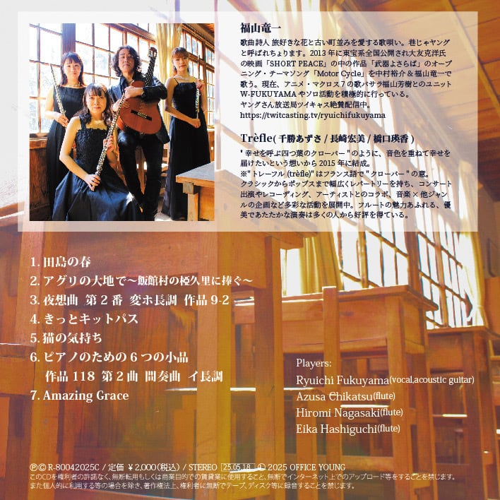 クラシック界で活躍中のフルートカルテットTrèfle(トレーフル/千勝あずさ,長崎宏美,橋口瑛香)との融合により福山竜一のお馴染みのナンバーがまた違った景色を見せてくれる…そんな作品に仕上がったアルバム「久音-kuon」。